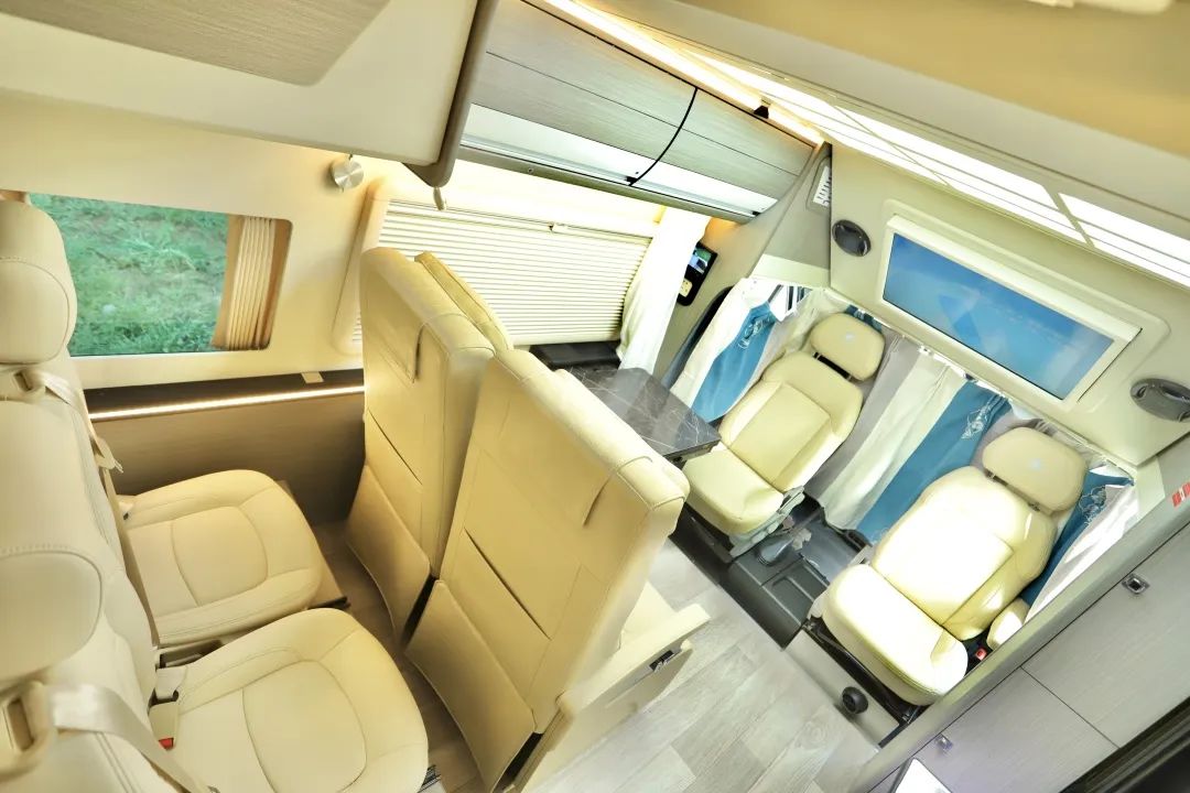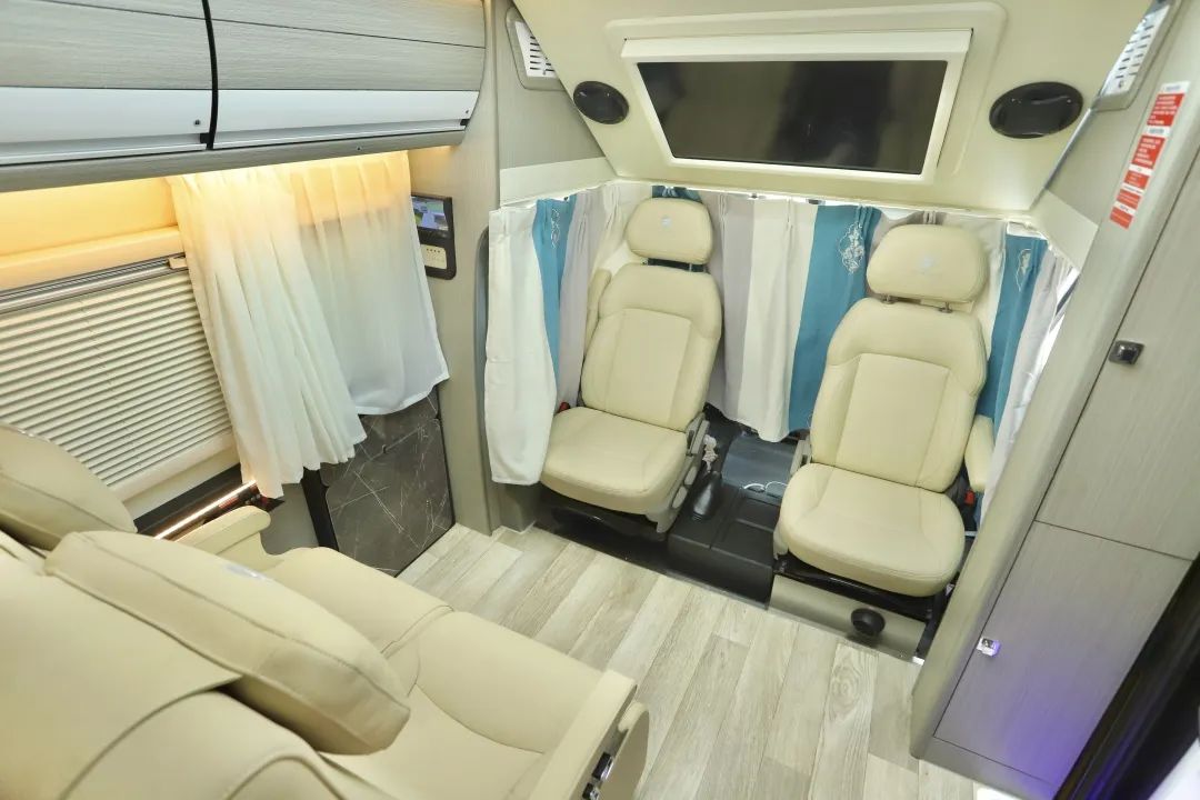 同样能做到前后左右移动以及靠背和腿托的调节,保证路上的舒适,牺牲了能按摩的航空座椅,得到的是过道与会客厅更大的空间。