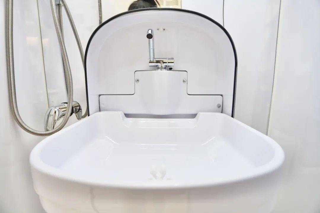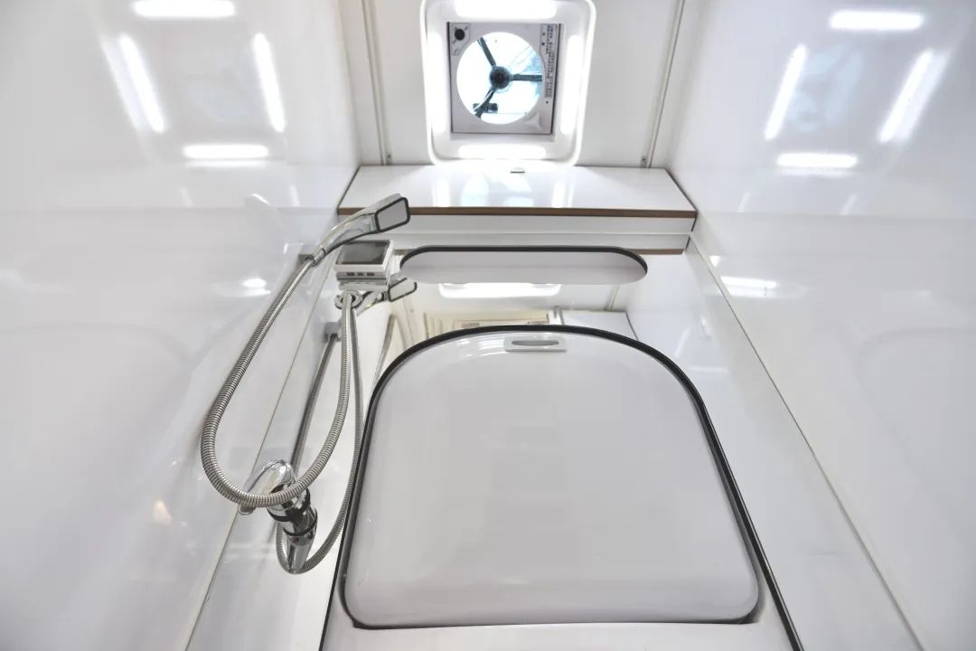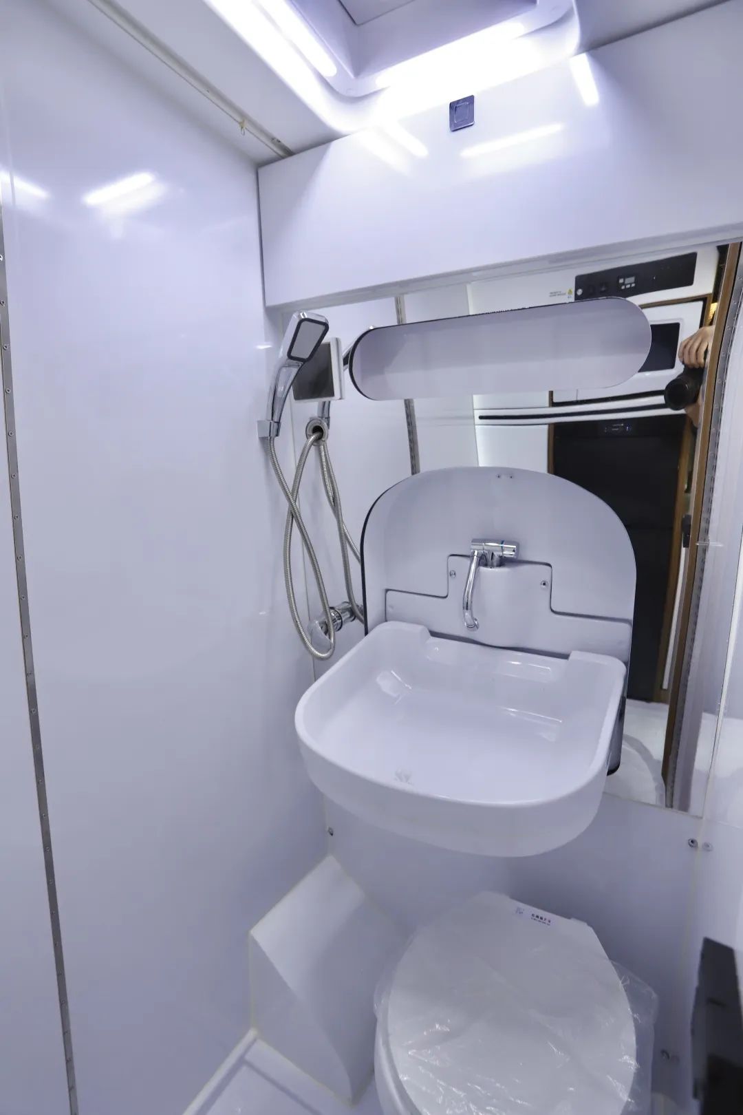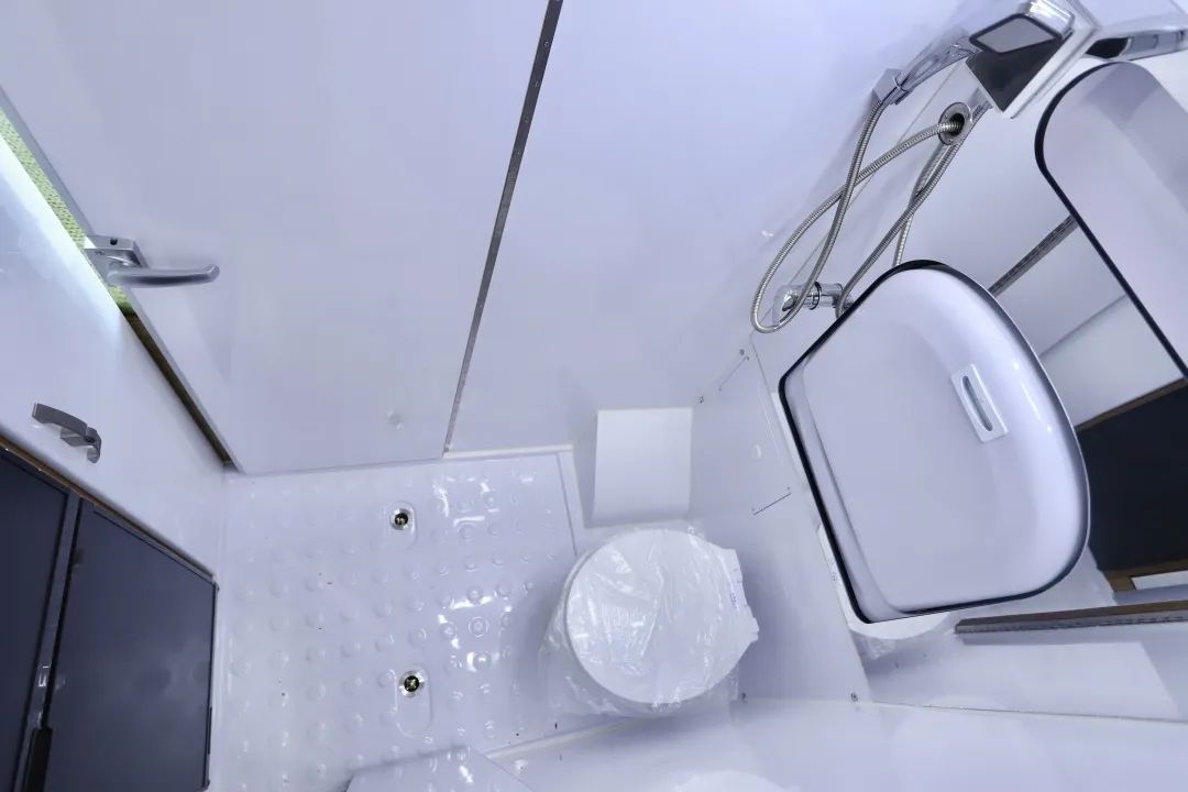 里面的设施有:电动粉碎马桶、淋浴花洒、防水五孔插座、嵌刻储物格以及带锁的储物空间,洗漱设施等都是非常齐全的,像独立照明以及双向换气扇就在上方,方便气味的疏散。