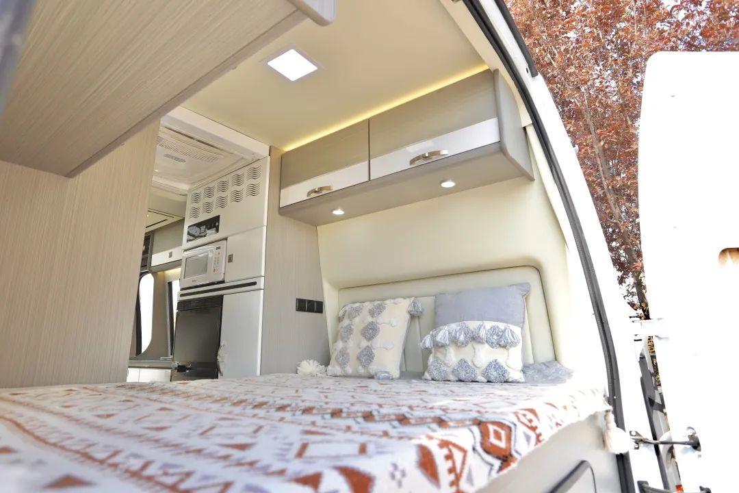 睡卧区采用的经典后横床设计,尺寸为1米3*1米9,可以容纳两人使用,床头床尾都有软包处理,柔软舒适。