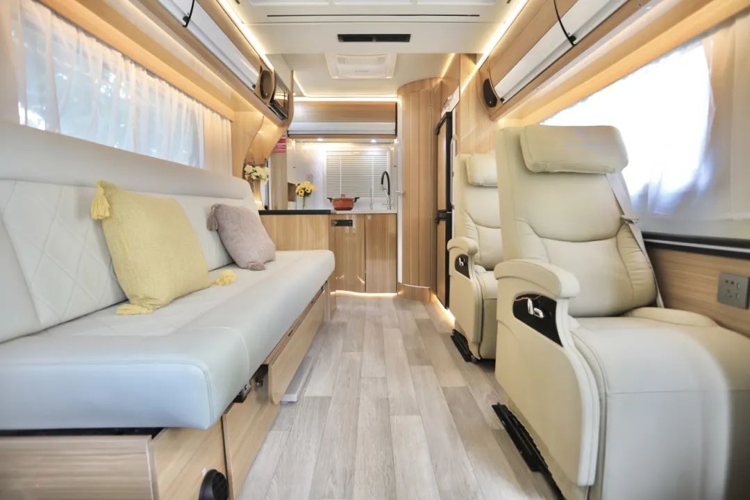 很多人不知道后置厨卫为什么魅力这么大?除了空间宽敞,住起来舒心以外,其实还有很多因素值得车友们喜欢。 底盘信息及车身尺寸 它不像C型车一样体型那么大,也不像B型车那样空间有所限制,而是蓝牌C证就能驾驶的T型房车,车长5米99,宽2米3,高3米。在面对限高杆时,车头有双重限高预警,它可以及时提供前方的限高阈值,方便我们更换路线,保证一路畅通。 采用的是依维柯欧胜底盘,承载力比较强,还是双发电系统,3.0T排量搭载8AT自动变速箱,动力性能上值得信赖。 其次,由于是后上门的房车,所以整车的布局显得非常宽敞。 会客厅到厨房区域有一个三米长的大走廊,两个人并排同行都没有问题,走廊的旁边有超全的配置,单看这两个航空座椅,既可以实现360度无死角旋转,还能调节椅背腿托缓解路上久坐带来的疲惫感,座椅还能实现前后左右的侧滑。 座椅旁边的墙体五孔插座、usb接口,偶尔忘记携带数据线也没关系,两个无线充也可以打开使用,非常贴心且便利。 对面就是一条两米长的大沙发,坐起来舒适,材质也是皮的,打理起来也更容易。它下面做了两个储物用的抽屉,容量非常大,想放啥就放啥,当然也有安全锁扣设计,防止路上颠簸会突然打开。 此外还有一张桌子隐藏在中间,同样带有安全锁扣,打开后可以直接向外抽拉,因为采用了无滑轨处理,所以无卫生死角问题,也不用担心走动时会被绊倒,桌子是椭圆造型原木色,尺寸很可观,打理起来也超级方便。 沙发还能变成双人大床,只需要拉住两侧的锁扣向外抽即可,一张1米3*2米的双人大床就出现了。 上方为您配备环绕式四组铝合金大吊柜,不仅重量轻,而且可以长时间使用,不用担心会发霉断裂,采用的无明锁设计,加上圆弧造型,不用担心突然站起会碰到头。 前方还有一个32寸的超大液晶网络电视,可以联网和投屏,旁边还有俩音响加持,视觉和听觉效果都特别好。 顶部就是一个超大的天花板,九宫格的灯池为车内提供主照明,距离地板有个180cm+,在客厅站着也不怕碰头。 人多有更多床铺需求时,天花板下降后,一张1米3*2米尺寸的双人大床就出现了,而且出厂自带床垫,床板与车顶大梁连接,两边也预埋了很多承重点,再加上承重带的加持, 承重600斤是完全没问题的,在吊床上休息同样让您安全感满满。 后上门处安装有洗衣机,原本放在卫生间内,经过我们实际使用以及结合车主们的反馈后,将洗衣机安装在了进门处,空间变大,晾晒衣服更方便。 进门左手边为室内厨房区域,一体成型的台面,干净好打理,洗菜池、高水位的水龙头还能冷热水调节,中间这块柴油炉区域就是用来展示厨艺的,它的功率可以达到5000W,有五个档位可以调节,煎炸烹煮都能做得到。另外燃料直接通过油管取自柴油箱里的柴油,补给会更方便,也省去了携带其他燃气罐的麻烦。 担心在车内做饭会油烟弥漫,上方的铝合金吊柜里内嵌了一个强排抽油烟机,两个档位可以自由调节,觉得距离太远,还可以通过电控按钮让它一键下降,与柴油炉的距离变近,让油烟无处可去。 如果您有在户外烹饪的需求,那这款车也可满足您,外面同样有柴油炉可以做饭,还有一个超长的不锈钢桌板可以供您使用。 厨房对面就是一个茶吧台,圆弧造型十分美观,上方内嵌有烧水煮茶的设备,还有一个自带反渗透功能的净水器,不用来回搬弄就能喝到直饮水。 上方还有红酒杯架可以让您午后微醺一下,微波炉的安装位置也是十分贴心,伸手就能碰到,方便您加热食物。 下方这一块区域也没有浪费,既能做鞋柜也能做储物空间,放置您的生活用品。 内置厨房旁边的卫生间也是一体成型而成,防水防渗透,入门是赛特福德抽拉马桶,可以旋转侧滑,大大提高脚下空间的利用率;上方的折叠洗手盆采用的是隐藏式设计,不用时直接嵌入墙体;大大小小储物空间,独立照明灯、双向换气扇、淋浴花洒以及五孔插座还有挂衣钩,配置超齐全。 出来卫生间超大立式衣柜、超大储物空间以及超大的152L双开门电冰箱,不怕您经常用,就怕您塞不满。 本车为您配备3000W逆变器、1000Ah锂电池、700W太阳能板、230L净水箱和80L灰水箱,这样的组合对您来说,够用了不? 高配现车一台,想了解更多关于这辆车的上装细节,请在评论区与我们留言互动哦~