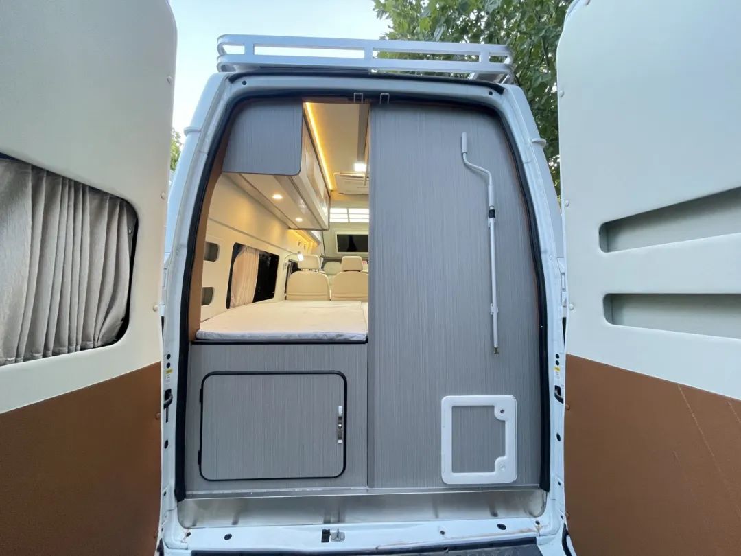 纯白色原厂车身搭配黑色侧拉玻璃,无多余拉花,经典又低调,车尾处可按需选装自行车架以及后爬梯,主要水电补给处就在主驾驶一侧尾部,重力加水口以及220V的外接市电口。
