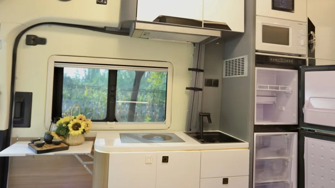 迎着金九银十,房车出行旺季的东风,2025 款飞翔家族基于福特 T8 底盘打造的 B 型房车 “精典” 正式亮相! 福特T8底盘,搭载第五代 Puma 2.3T 柴油发动机,8AT采埃孚柴油自动挡变速箱,最大功率可达 126kW 以上,最大扭矩高达 430N・m,动力强。 福特T8底盘有多好开全国关注房车的人都知道! 底盘好是因为底盘厂家的功劳,但上装好用才能归功于飞翔房车工厂。 打开中门,映入眼帘的依然是我们熟悉的外置厨房区域,上方2.5×3米的遮阳棚,户外照明给大家配备到位。 月牙卡扣打开将会得到一个大的操作厨台,长140公分、宽61公分,您摆上十个盘八个菜空间也绰绰有余!而且下方有小支腿,稳固性非常好,操作收放非常便捷。 上方的储物采用内外贯通式的设计,内外拿取相当方便,不用您来回的跑上跑下拿厨具。 炉具采用便携式柴油炉,燃料直取自油箱内的柴油,经济节能,还具有高原模式。 车尾处,之前我们见到的洗衣机都安装在房车内部,空间又小,使用的时候还要蹲着、趴着,对于上年纪的人来说特别不方便,但飞翔在车尾准备了一个背包式洗衣机,高度适宜、操作简单,插上水管连接上水口下水口即可轻松使用,洗衣机需要清理时下方还有活软塞,提高了您后期的使用体验感。 当然您短途出行不需要使用时,四周已经提前预留了拆卸螺丝,可以拆下来放家里,操作很简单。 旁边是爬梯+自行车架,可以放两台自行车,车顶上是600W的太阳能板,想要清洗的话通过后爬梯上去也非常方便。 下方安装了电动驻车支腿,遥控一键控制,上下车时车辆不会产生晃动,提高了车的稳定性,生活起来更加舒适。 主驾驶一侧后方配备两种充电方式:220V的外接市电口以及新能源接口、重力加水口,这款车的水电给大家标配的是200L清水、75L灰水,5000W逆变器,10度电,水电还是比较充足的! 来到车内第一印象就一个词!通透!而且这款车B型车内不仅有床、还是三张! 有车友就会问“有必要 要这么多床吗?”确实在B型房车狭小的空间内,如果多人在里面生活,肯定会造成一些不便。但是我们设计的三张床,并非为了设计而设计,在平时,它们大多是储物空间,仅在满载或者应急状态下才会作为床铺展示出来。 比如头顶上方这张折叠抽拉式的吊床,需要时只需要下拉然后向外抽拉即可呈现一张1.3×2米的双人床,早上起床需要收回时,您也不用考虑被子、枕头的收纳问题,直接往前一推,隐藏在车头处即可,不占用您任何额外的储物空间以及会客厅的上方空间。 后方的两张床也大有玄机,上方看似是一组吊柜,经过下降,外翻完全展开后与下方固定床未拓展时的尺寸相同,200×80公分的单人床。 下方床铺可利用卫生间门板进行横向拓展,完全展开尺寸为1.3×2米,妥妥的一张双人床。 很多人都在说,这样设计是个BUG,床铺拓展完以后卫生间马桶无法正常使用,其实这个问题是极限睡5人的状态,但是这款车卫生间马桶也照样能用,您可以准备一个便携式马桶,晚上只需要把马桶放在过道里,即可解决此问题。 当然如果您是四人出行的话,卫生间就无需拓展,上下各睡一人,前方吊床睡两个人,卫生间照常使用。 床下储物空间很宽敞,真正做到了床有多大储物空间就有多大,而且床下是双开门的设计,拿取更加方便。 卫生间门板上安装全身镜,而且门的边角也设计成了圆弧状 ,比原来看上去舒服不少。 内部尺寸也变大了十几公分,双臂可以张开,尺寸为100×90公分,宽敞不拥挤。 为您准备的有抽拉马桶,一体成型洗手盆、淋浴花洒储物空间等等,满足您出行的洗浴需求。 出来卫生间,床对面的衣柜采用上下分格设计,容量的话比以往的B型房车更加可观。 为了节省空间,提升您的房车使用感,内置厨房炉具使用的是电磁炉,成本远远高于市面上普通的电磁炉,最容易出现的问题就是糊锅,因为在加热的过程中它是额定2200W的峰值功率在工作,利用中间的停顿来控温。 而这款电磁炉是变频的设计,温度设定到200度,它就会一直保持您设定的200度的低功率,温度采用五级调节,当然您也可以设定温度以及做饭的不同模式,优点就是温度可控同时能做到节能变频。 控制面板中间的防水小按钮随时用来感应以便更好的达到您设定的温度。 熟悉飞翔房车的车友知道一般内置厨房水池旁有净水装置,而这款房车的内置厨房内没有,将净水机水龙头装在卫生间。 这一设计是结合了很多房车老玩家的建议,因为洗脸刷牙在卫生间进行,开房车出行在外加的水 水质没保证,刷牙需用纯净水,做饭、喝茶去卫生间接水不麻烦,洗漱去外边接水麻烦,所以采用了这种设计。 厨房区域的上下储物空间容量可观,方便您分类存放厨具、调味料等,右手边最上方为床的控制按钮、整车控制面板、微波炉、150L独立调节温度的房车专用冰箱。 主副驾驶座椅往后旋转180度,与二排座椅形成4人/5人对座的状态。 会客厅桌子采用788同款桌子,最小可隐藏在车身一侧,最大可达到115×60公分的尺寸。 如果您还觉得这张桌子不够大,整个厨房台面长度为100公分,加上延长板总长度为150公分,与会客厅桌子形成了“L型”大台面,全家人吃个大餐都够了! 会客厅旁边车窗最大的亮点就是行车过程中窗子可以打开通风,隐私帘防蚊帘均有配备。 缺点就是下雨的时候,它的性能不如外推窗,当然如果您喜欢外推窗也可以给您换成外推窗的形式。 前方的电视考虑到有的车友会炒股,尺寸达到了 50 寸,您看